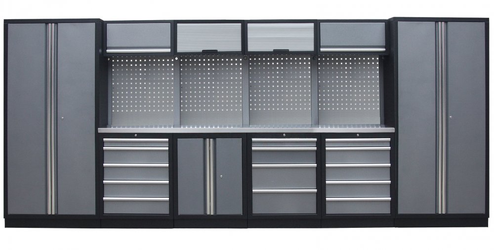 Sestava 21 ks, 4535 x 495 x 2000 mm, nerezová pracovní deska, modulární, celokovová, šedá. Horní skříňky: 2 výklopné, 2 s roletou. Spodní skříňky: dvoukřídlá / 4 a 2x 5 šuplíková. Vysoké skříně: 2 široké. 4 děrované desky s roztečí 38 x 38 mm. Kvalitní dílenský nábytek vhodný pro profesionální servisy i domácí garáže a dílny. Celý popis