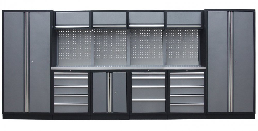 Sestava 21 ks, 4535 x 495 x 2000 mm, nerezová pracovní deska, modulární, celokovová, šedá. Horní skříňky: 4 výklopné. Spodní skříňky: dvoukřídlá / 4 a 2x 5 šuplíková. Vysoké skříně: 2 široké. 4 děrované desky s roztečí 38 x 38 mm. Kvalitní dílenský nábytek vhodný pro profesionální servisy i domácí garáže a dílny. Celý popis