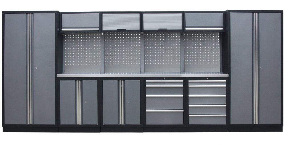Sestava 21 ks, 4535 x 495 x 2000 mm, nerezová pracovní deska, modulární, celokovová, šedá. Horní skříňky: 2 výklopné, 2 s roletou. Spodní skříňky: 2x dvoukřídlá / 4 a 5 šuplíková. Vysoké skříně: 2 široké. 4 děrované desky s roztečí 38 x 38 mm. Kvalitní dílenský nábytek vhodný pro profesionální servisy i domácí garáže a dílny. Celý popis