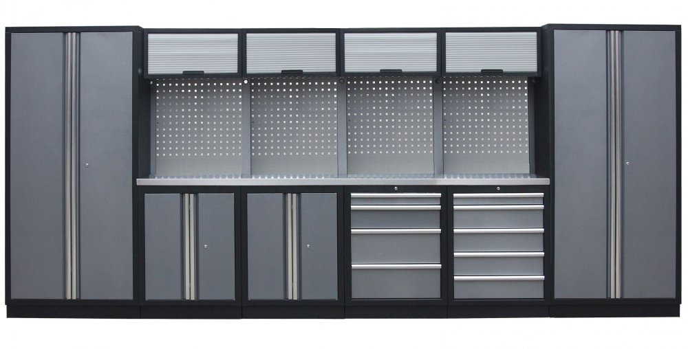 Sestava 21 ks, 4535 x 495 x 2000 mm, nerezová pracovní deska, modulární, celokovová, šedá. Horní skříňky: 4 s roletou. Spodní skříňky: 2x dvoukřídlá / 4 a 5 šuplíková. Vysoké skříně: 2 široké. 4 děrované desky s roztečí 38 x 38 mm. Kvalitní dílenský nábytek vhodný pro profesionální servisy i domácí garáže a dílny. Celý popis