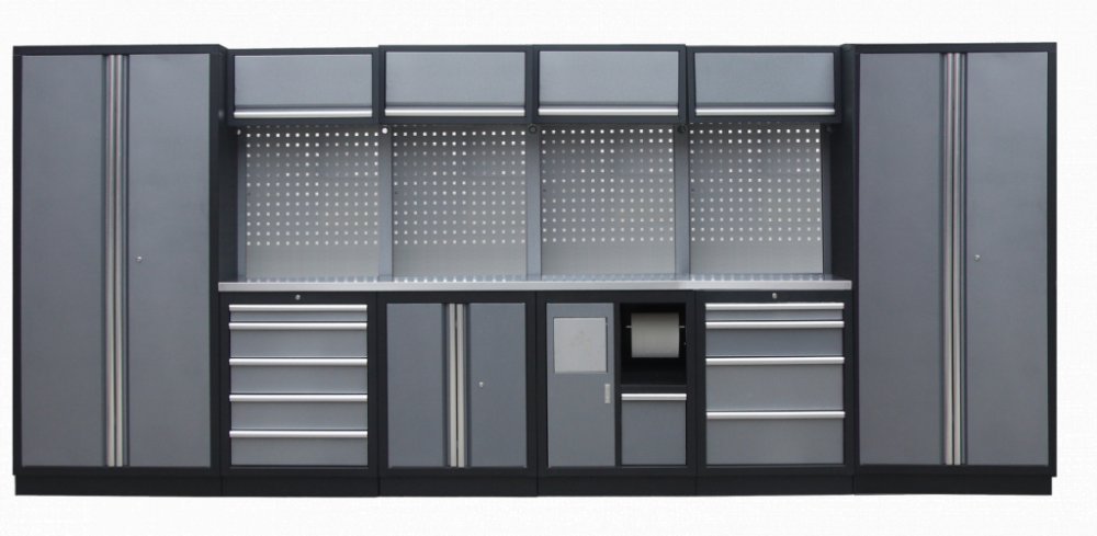Sestava 21 ks, 4535 x 495 x 2000 mm, nerezová pracovní deska, modulární, celokovová, šedá. Horní skříňky: 4 výklopné. Spodní skříňky: dvoukřídlá / s košem / 4 a 5 šuplíková. Vysoké skříně: 2 úzké. 4 děrované desky s roztečí 38 x 38 mm. Kvalitní dílenský nábytek vhodný pro profesionální servisy i domácí garáže a dílny. Celý popis