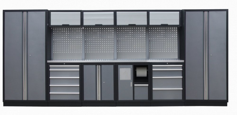 Sestava 21 ks, 4535 x 495 x 2000 mm, nerezová pracovní deska, modulární, celokovová, šedá. Horní skříňky: 4 s roletou Spodní skříňky: dvoukřídlá / s košem / 4 a 5 šuplíková. Vysoké skříně: 2 široké. 4 děrované desky s roztečí 38 x 38 mm. Kvalitní dílenský nábytek vhodný pro profesionální servisy i domácí garáže a dílny. Celý popis