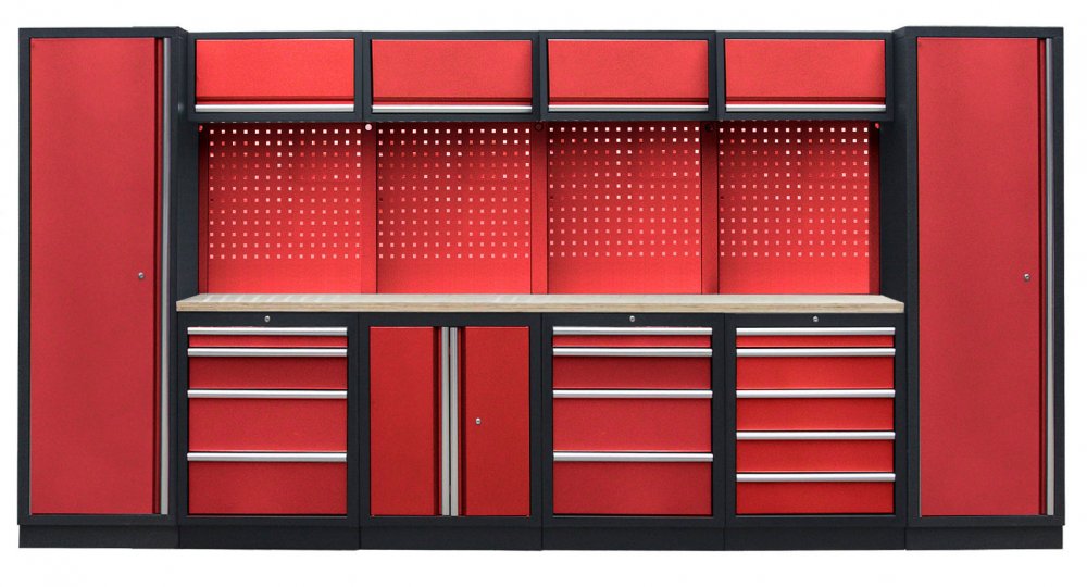 Sestava nábytku v sobě skrývá dostatečné množství úložného prostoru pro vaše nářadí, autotechniku i dílenské vybavení. V kombinaci s bytelnou pracovní deskou získáte multifunkční stěnu, se kterou vám půjde práce od ruky ve všech směrech.