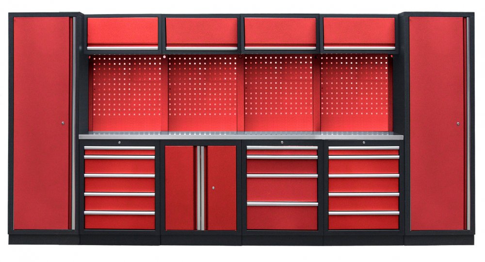 Sestava 21 ks dílenského nábytku PROFI RED s nerezovou pracovní deskou