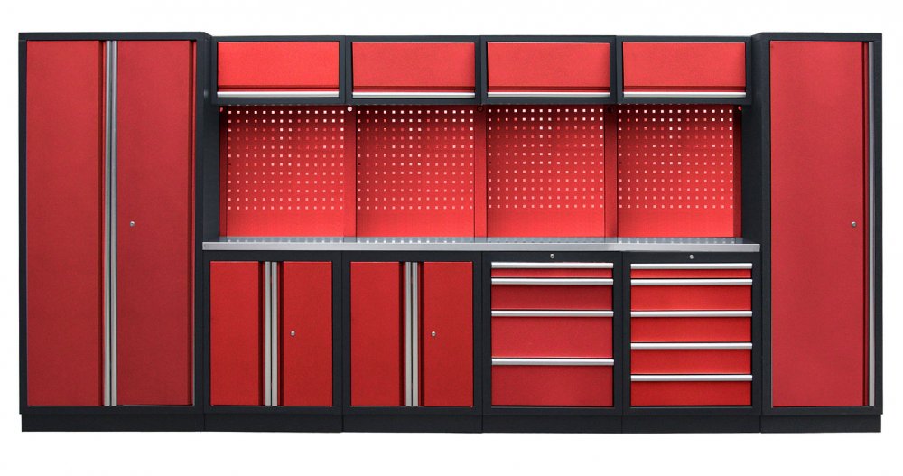 Sestava 21 ks dílenského nábytku PROFI RED s nerezovou pracovní deskou