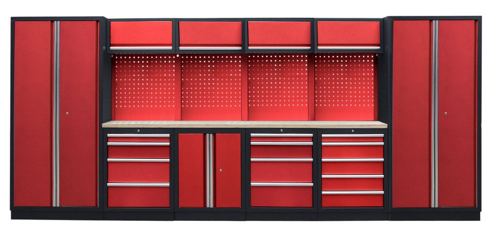 Sestava 21 ks, 4535 x 495 x 2000 mm, dřevěná pracovní deska, modulární, celokovová, červená. Horní skříňky: 4 výklopné. Spodní skříňky: dvoukřídlá / 2x 4 a 5 šuplíková. Vysoké skříně: 2 široké. 4 děrované desky s roztečí 38 x 38 mm. Kvalitní dílenský nábytek vhodný pro profesionální servisy i domácí garáže a dílny. Celý popis