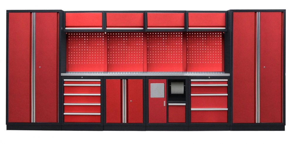 Sestava 21 ks, 4535 x 495 x 2000 mm, nerezová pracovní deska, modulární, celokovová, červená. Horní skříňky: 4 výklopné. Spodní skříňky: dvoukřídlá / s košem / 4 a 5 šuplíková. Vysoké skříně: 2 široké. 4 děrované desky s roztečí 38 x 38 mm. Kvalitní dílenský nábytek vhodný pro profesionální servisy i domácí garáže a dílny. Celý popis