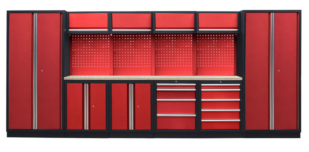 Sestava 21 ks, 4535 x 495 x 2000 mm, dřevěná pracovní deska, modulární, celokovová, červená. Horní skříňky: 4 výklopné. Spodní skříňky: 2x dvoukřídlá / 4 a 5 šuplíková. Vysoké skříně: 2 široké. 4 děrované desky s roztečí 38 x 38 mm. Kvalitní dílenský nábytek vhodný pro profesionální servisy i domácí garáže a dílny. Celý popis