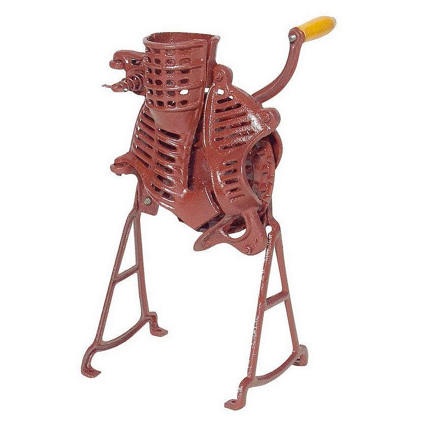 Litinový loupač na kukuřici s kličkou pro ruční pohon.
