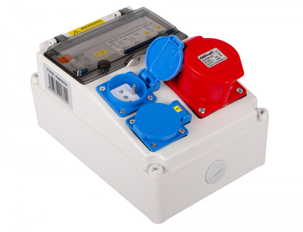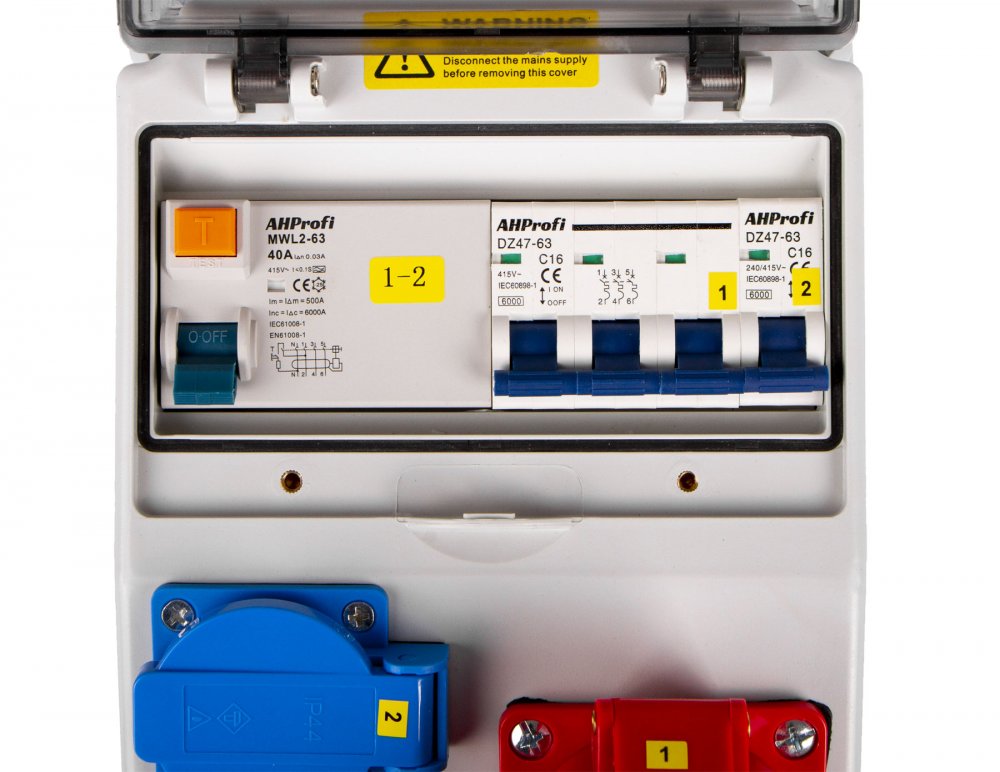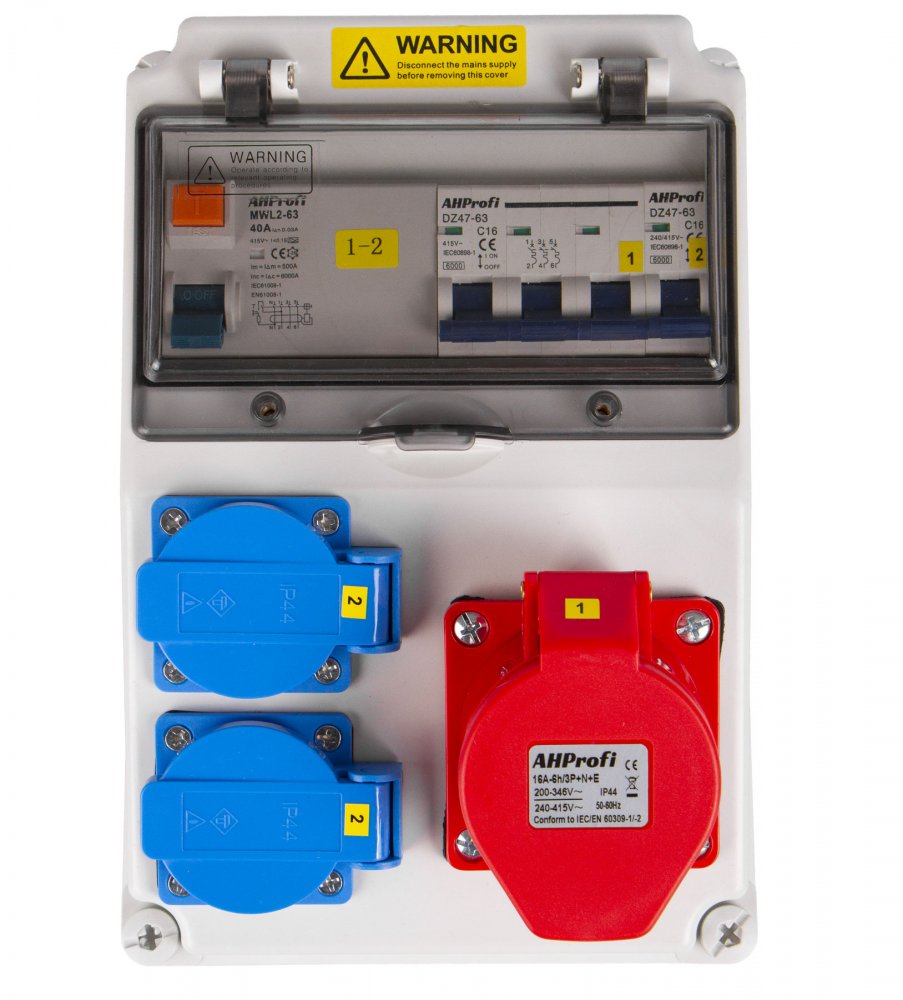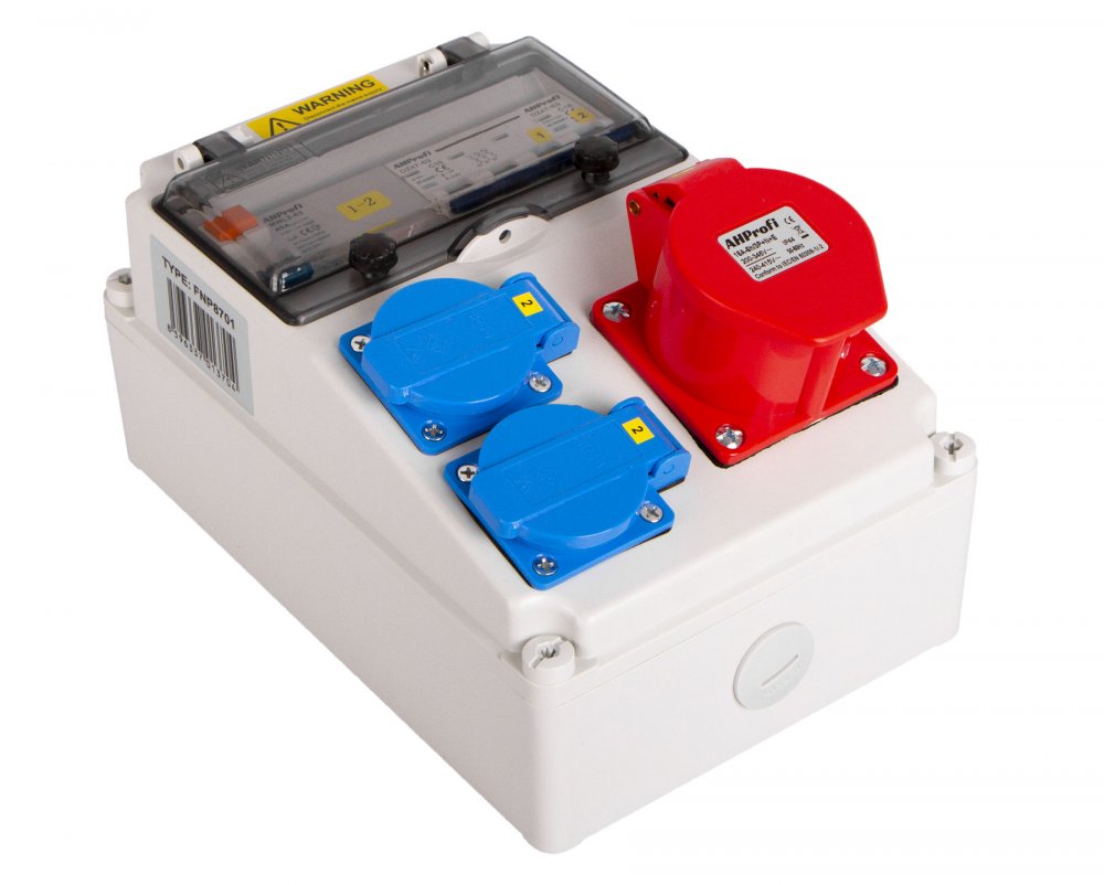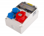 Rozvodná skříň má 2 zásuvky 16 A a zásuvku 16 A 5P.