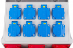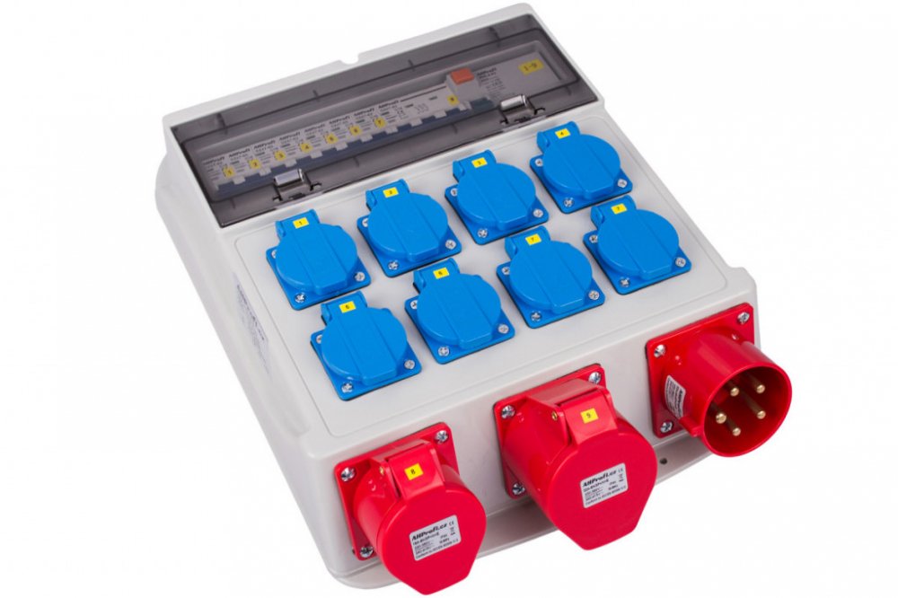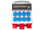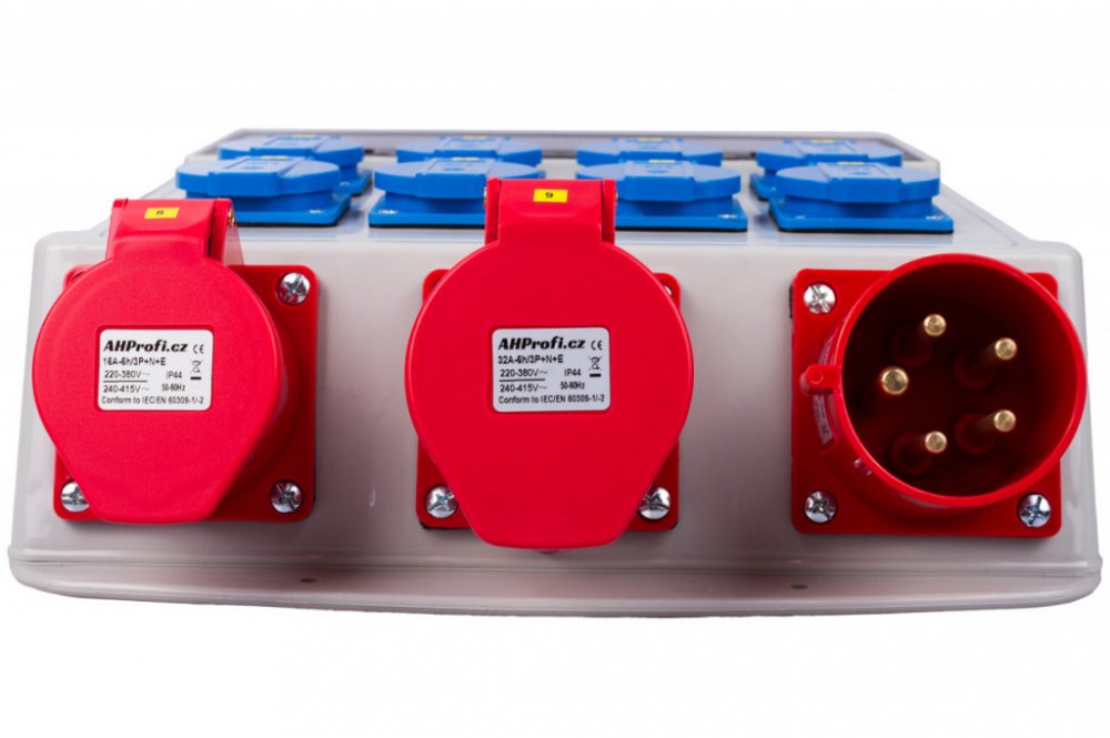 Rozvodná skříň má vstup 32A 5P. Dále má 10 výstupů, 8 zásuvek 16A, zásuvku 16A 5P a zásuvku 32A 5P.