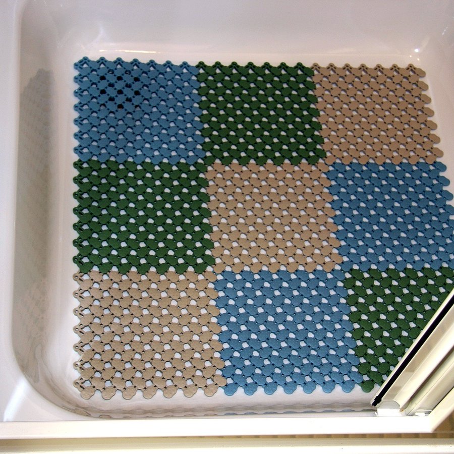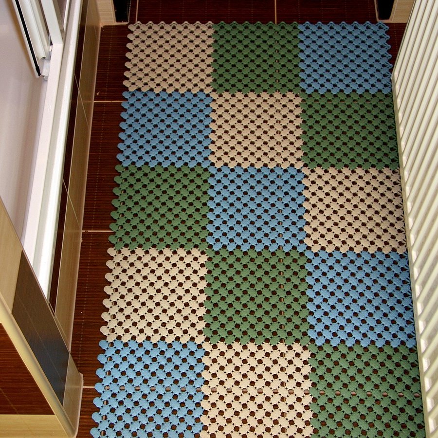 Rohožka je modulární, což umožnuje dosáhnout v podstatě jakéhokoliv rozměru a to velice snadným napojením jednotlivých modulů na sebe (viz foto). Lze také kombinovat různé barvy (nabízíme béžovou, zelenou, modrou) a tím dosáhnout zajímavých designů. V případě potřeby lze rohož zkrátit (seříznout nožem), aby rohož pasovala například okolo stěn.
