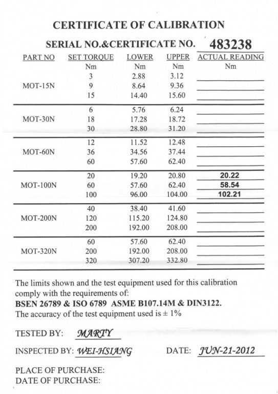 Ke klíči se dodává certifikát kalibrace viz. foto.