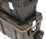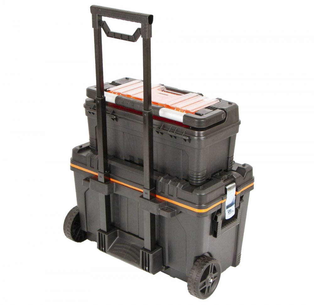 Spodní box je opatřen teleskopickým madlem (90 cm) a kolečky, uvnitř spodního boxu se nachází odnímatelné plato na drobnější materiál a velký úložný prostor.