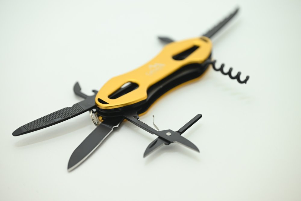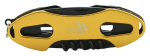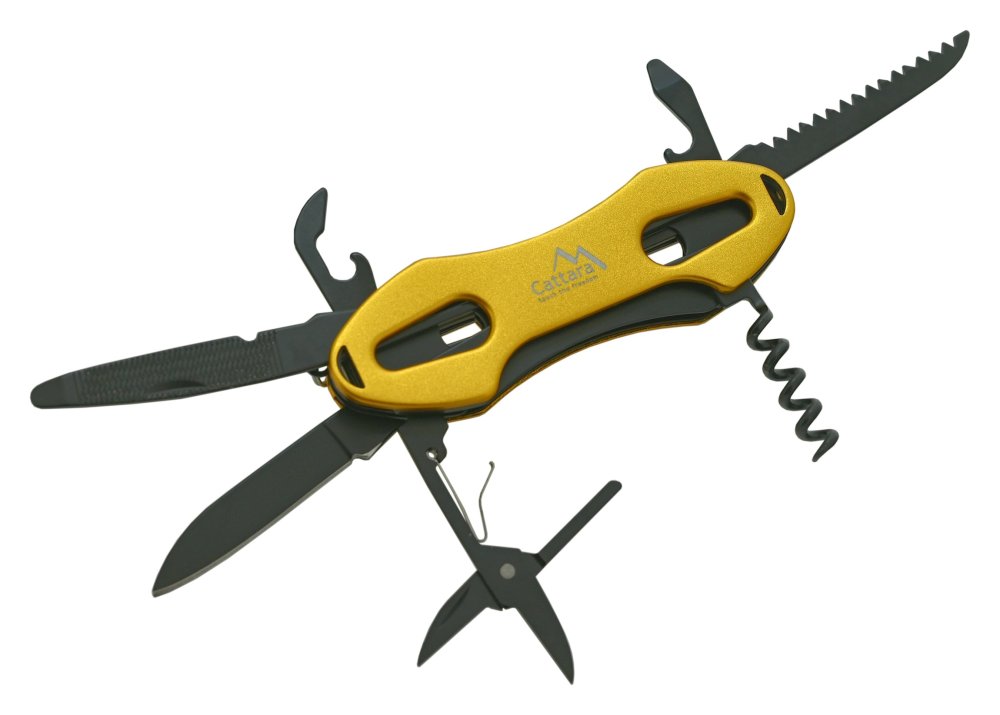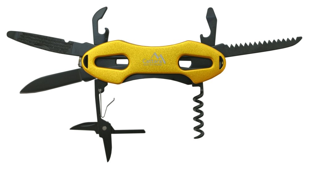 Multifunkční nůž CAMP 7v1 z aluminia žluté metalické barvy, s nástroji z nožířské oceli. Užitečný pomocník pro camping, rybaření a další outdoor využití.