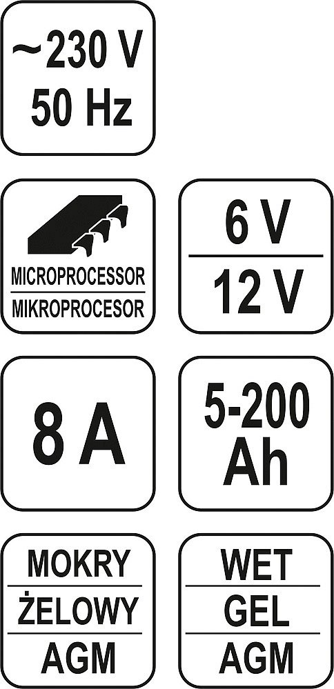 Elektronická nabíječka akumulátorů s napájením 230V, určená pro 6 a 12V akumulátory o kapacitě 5-200 Ah.