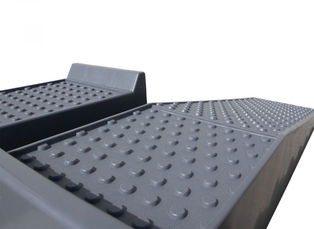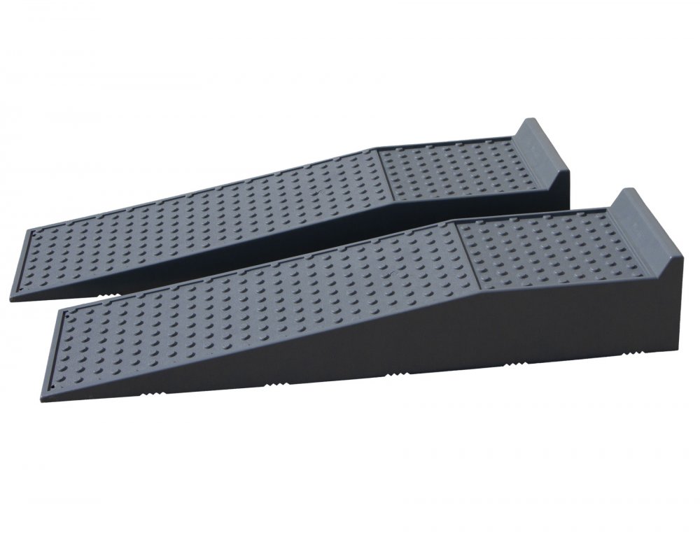 Rampy jsou opatřeny otvory pro připevnění k zemi pro lepší stabilitu a pro lepší přilnavost pneumatik jsou opatřeny drážkami na nájezdové ploše.