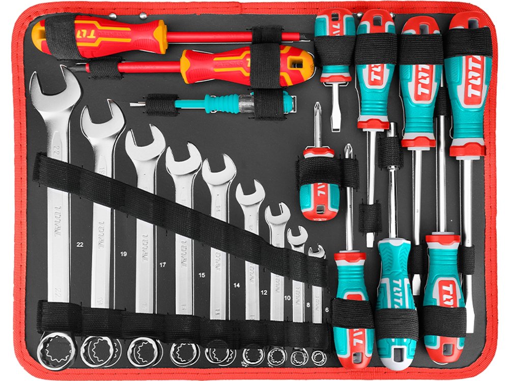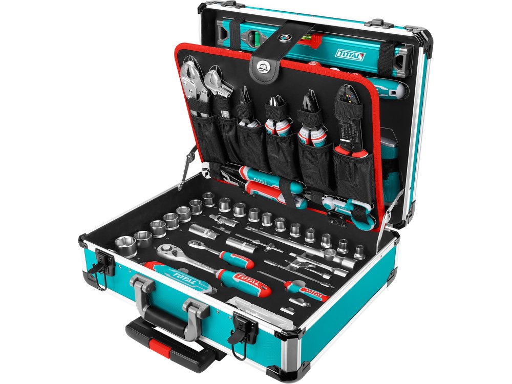 Bohatá sada obsahující nejrůznější ruční nářadí od kleští, přes gola sadu až po vodováhu. Vše uloženo v praktickém kufru s kolečky a výsuvnou rukojetí.