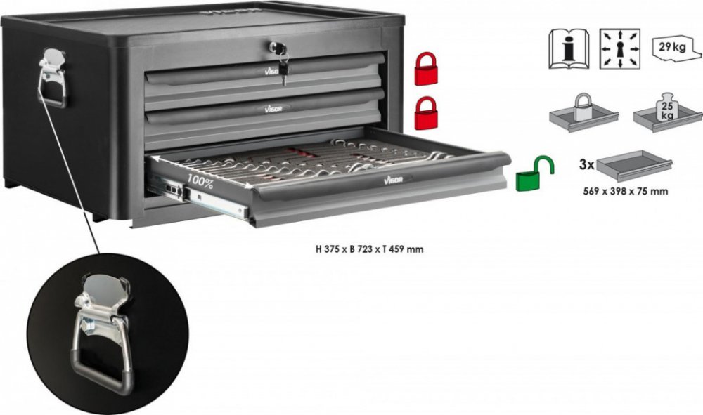 Nástavba nabízí 3 uzamykatelné zásuvky pro uložení nářadí nebo výplní s nářadím.