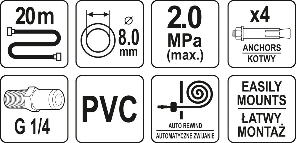 Naviják lze upevnit přímo na zeď. Hadice je zhotovená z PVC materiálu, odolného vůči nízkým i vysokým teplotám, stárnutí a agresivním chemikáliím.