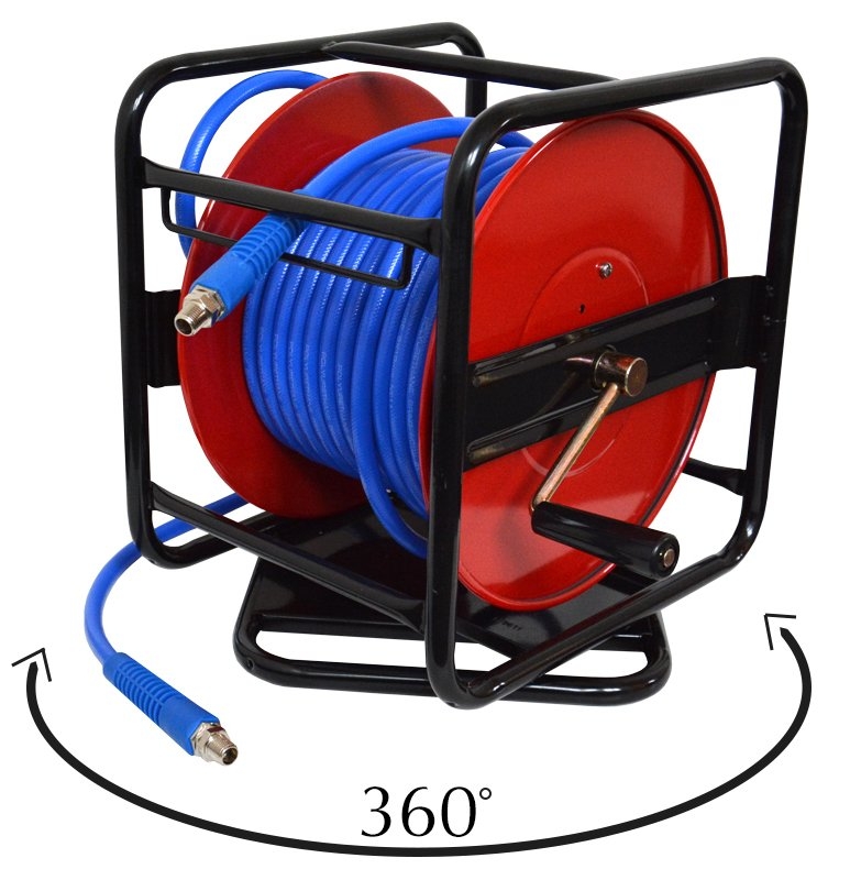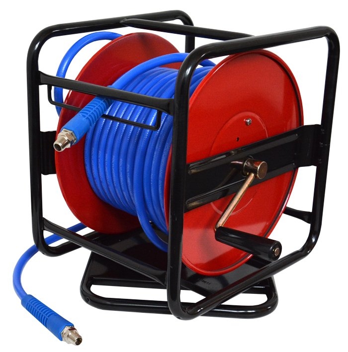 Profesionální naviják ruční přenosný s polyuretanovou, opletením (textilní vložkou) zesílenou vysokotlakou hadicí na stlačený vzduch 8 x 12 mm délky 30 m.