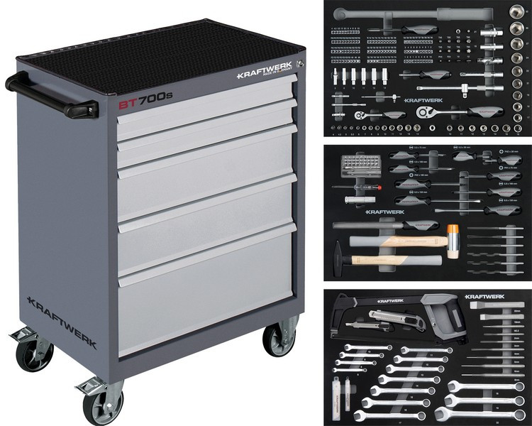 - 259 dílná základní sestava nářadí uložena ve 5 zásuvkách - 3 plně vybavených modulů nářadím řady Basic-Line - uloženo v pěnových EVA vložkách - dílenský vozík MADE IN GERMANY 5 zásuvek - velmi stabilní dvouplášťová konstrukce z ocelového plechu - 5 zásuvek s kuličkovými ložisky, plný výsuv - boční centrální zamykání všech zásuvek cylindrickým zámkem - se dvěma pevnými a otočnými koly
