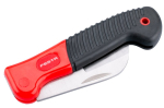 Zavírací elektrikářský nůž se zahnutou čepelí, silná čepel se dvojím ostřím usnadňujícím odizolovávání vodičů, pogumovaná ergonomická rukojeť, blistr.