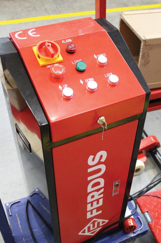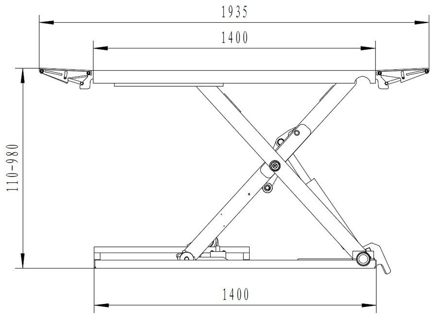 - Hydraulický agregát ve skříňce dodává olej o tlaku 14MPa do dvou hydraulických válců. Na každou plošinu připadá jeden hydraulický válec. Pohyb obou válců je svázán silnou spojovací hřídelí na spodní ocelové základně. Robustní nůžkový mechanismus udržuje plošiny vždy ve vodorovné poloze.