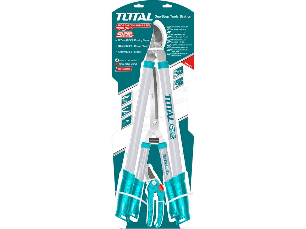 Set 3ks zahradních nůžek obsahuje 1ks 200mm zahradnických nůžek, 1ks 550mm nůžky na živý plot a 1ks 690mm nůžky na větve. Nůžky mají tepelně tvrzené ostří.
