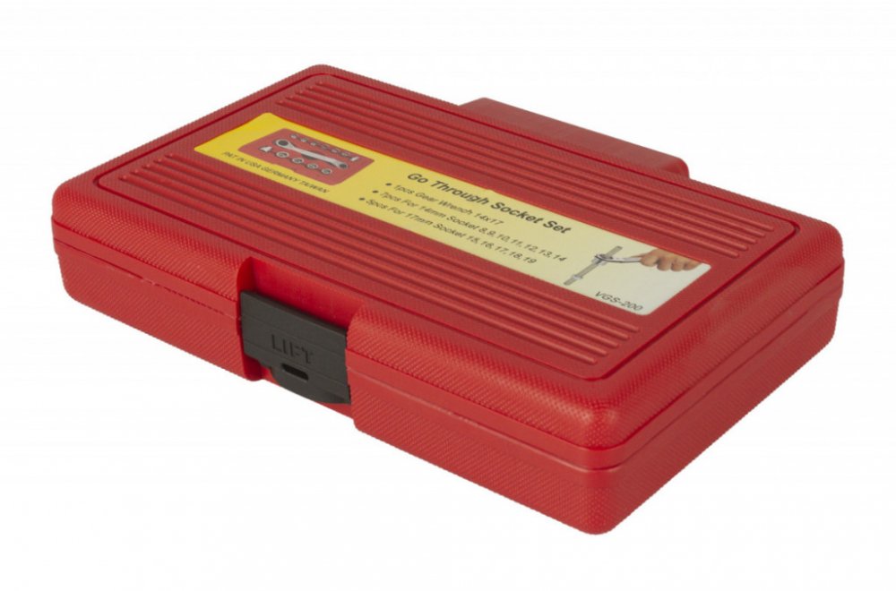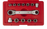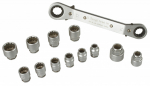 V sadě naleznete ráčnový oboustranný klíč o základních velikostech 14 a 17 mm a dále 12 ks nástrčných adaptérů.