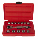 Sada oboustranného ráčnového očkového klíče s nástavci.