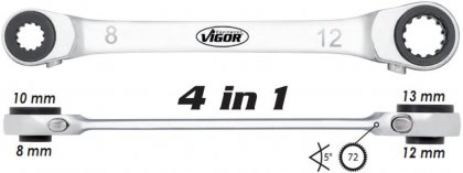 Oboustranný ráčnový klíč (4 v 1) má na jedné straně ráčnové klíče 8 mm a 10 mm a na straně druhé 12 mm a 13 mm.