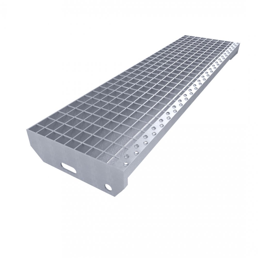 Ocelové schodišťové stupně jsou žárově pozinkovány, což zajišťuje jejich vysokou odolnost vůči korozi. Jsou opatřeny dvojitě děrovanou protiskluzovou nášlapnou hranou, která výrazně snižuje riziko uklouznutí, a bočnicemi s předvrtanými otvory pro snadné přišroubování na konstrukci. Toto praktické řešení minimalizuje riziko uklouznutí, i při znečištění schodů například olejem. Schodišťové stupně splňují požadavky normy DIN 24531.