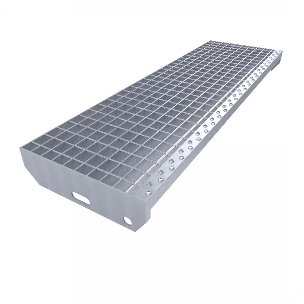 Ocelové schodišťové stupně jsou žárově pozinkovány, což zajišťuje jejich vysokou odolnost vůči korozi. Jsou opatřeny dvojitě děrovanou protiskluzovou nášlapnou hranou, která výrazně snižuje riziko uklouznutí, a bočnicemi s předvrtanými otvory pro snadné přišroubování na konstrukci. Toto praktické řešení minimalizuje riziko uklouznutí, i při znečištění schodů například olejem. Schodišťové stupně splňují požadavky normy DIN 24531.