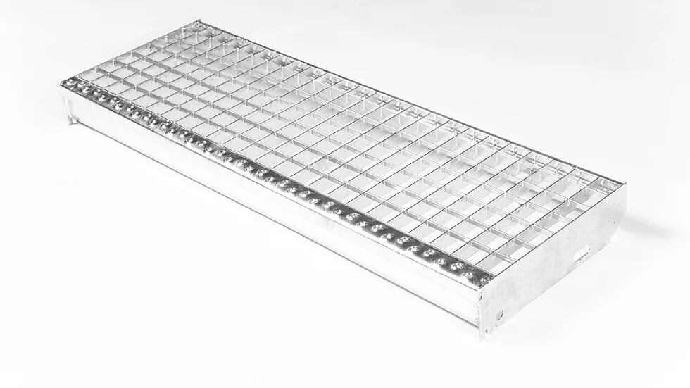 Ocelové schodišťové stupně jsou žárově pozinkovány, což zajišťuje jejich vysokou odolnost vůči korozi. Jsou opatřeny dvojitě děrovanou protiskluzovou nášlapnou hranou, která výrazně snižuje riziko uklouznutí, a bočnicemi s předvrtanými otvory pro snadné přišroubování na konstrukci. Toto praktické řešení minimalizuje riziko uklouznutí, i při znečištění schodů například olejem. Schodišťové stupně splňují požadavky normy DIN 24531.