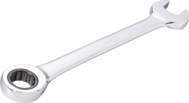 Chromovaný očkoplochý ráčnový klíč.