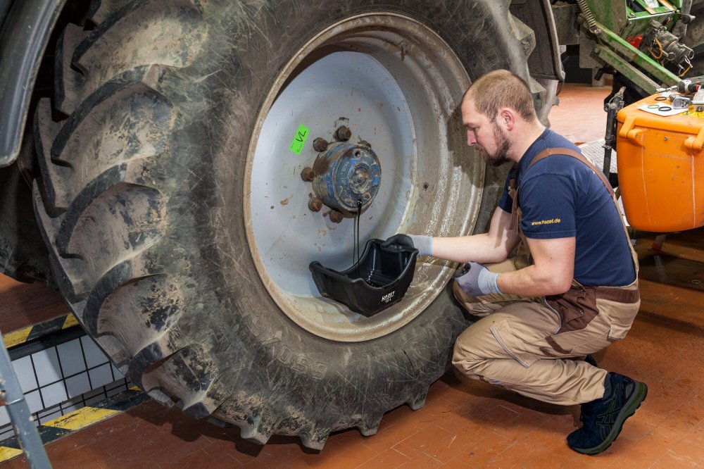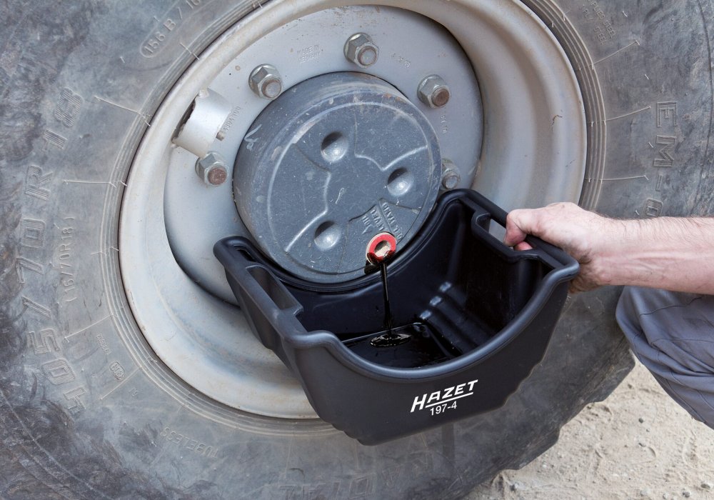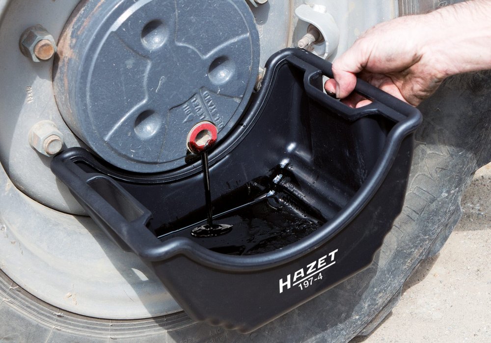 Odkapávací nádoba (miska) pro snadný a bezpečný sběr oleje vytékajícího z nápravy při demontáži nebo opravě na nákladních nebo užitkových vozech.