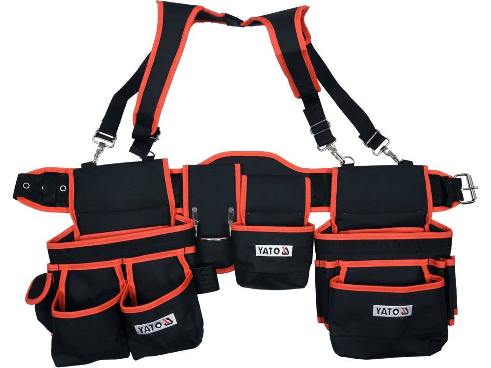 Opasek na nářadí s popruhy a dvěma velkými univerzálními kapsami, kovovým držákem na kladivo a jednou hlubokou kapsou na hřebíky nebo šrouby. Pro uložení a přepravu nářadí používaného při práci.