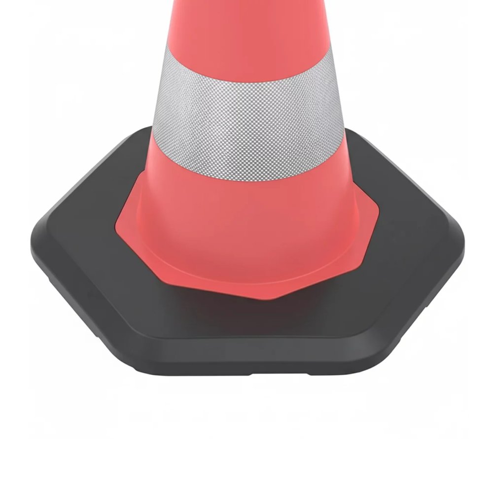 Zářivě oranžová signální barva těla kuželu zajišťuje vynikající vizuální kontrast během dne, což je klíčové pro bezpečnost na silnicích i staveništích. Materiál PE je plně stabilizován proti UV záření, mrazu i vlhkosti, díky čemuž si kužel zachovává svou pružnost a barevnou stálost i při dlouhodobém vystavení slunci v teplotách od -10 °C do +50 °C. Robustní konstrukce podstavce o rozměru 38 cm umožňuje pevné ustavení na jakémkoliv zpevněném i nezpevněném povrchu.