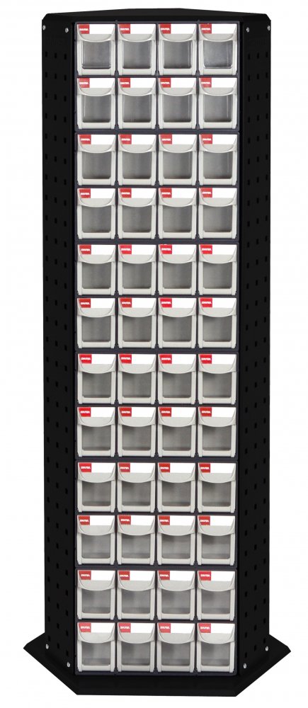 Zásuvky mají transparentní čelo, jsou opatřeny madlem a popisovacím štítkem pro přesnou identifikaci uloženého materiálu. Díky možnosti otočení o 360° extrémně spoří prostor v dílně a zefektivňuje skladování.