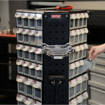 Obsahuje 144 plně výklopných průhledných boxů pro uskladnění součástek a materiálu (např. šrouby, matky, žárovky, hřebíky apod.).
