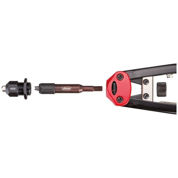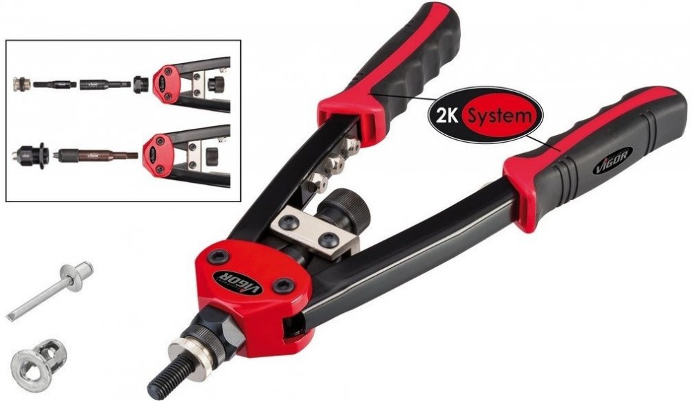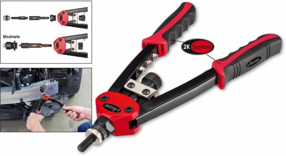 Profesionální nýtovací kleště německé značky Vigor pro práci se slepými nýty i nýtovacími maticemi. Roznýtujete měděné, mosazné, ocelové a nerezové nýty. Celková délka kleští je 32 cm.