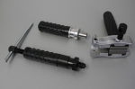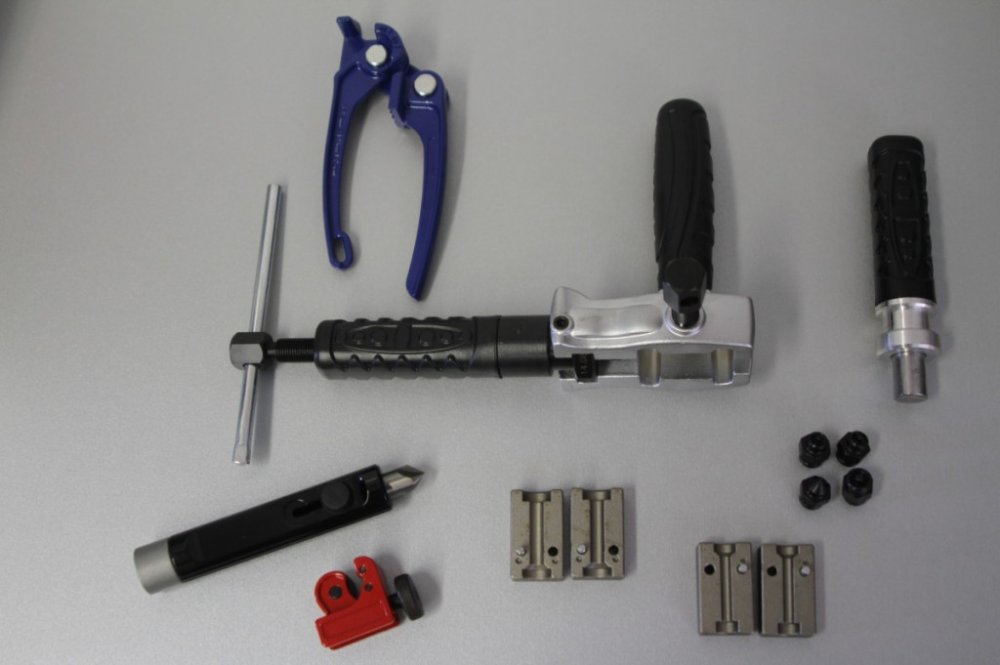 Hydraulická pertlovací souprava pro snadné a přesné pertlování o rozměrech 4,75 mm a 6 mm přímo na voze. Sada dále s čističem hran, ohýbačkou a řezačkou trubek.