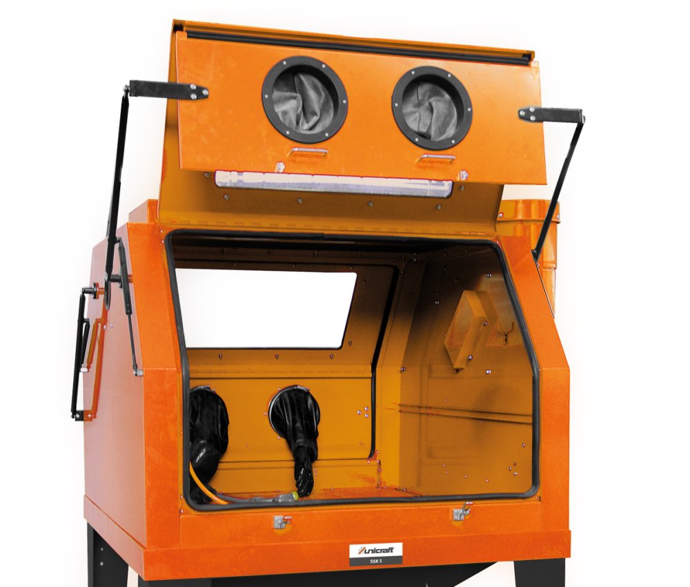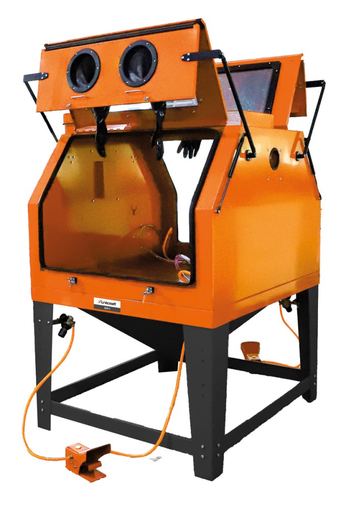 Samostatně stojící box s aktivním odsáváním pro pískování středně velkých předmětů.