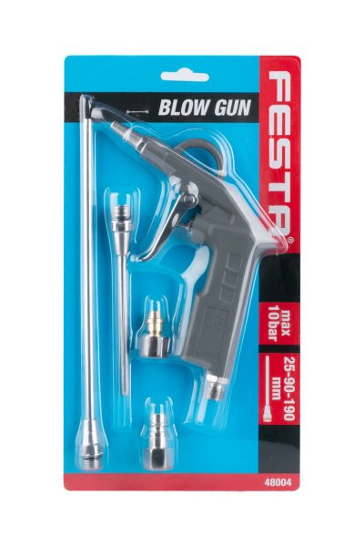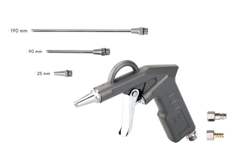 ofukovací pistole s nástavci 25, 90 a 190 mm pracovní tlak max 10 barů, spotřeba vzduchu dle tlaku od 110 - 300 L/min. připjení rychlospojkou nebo náústkem o průměru 8,5 mm na hadici