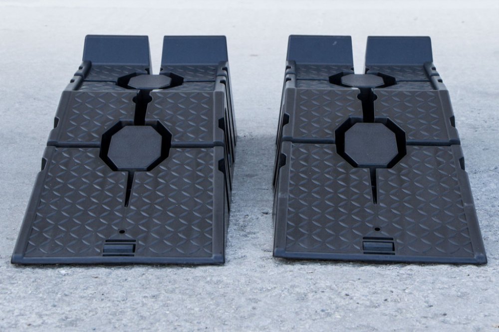 Nájezdové rampy z kvalitního pevného plastu pro profesionální použití, nosnost 2,5 tuny/pár, pro šířku pneumatiky až 240 mm, vzorek pro zvýšení trakce a zamezení sklouznutí. Celý popis