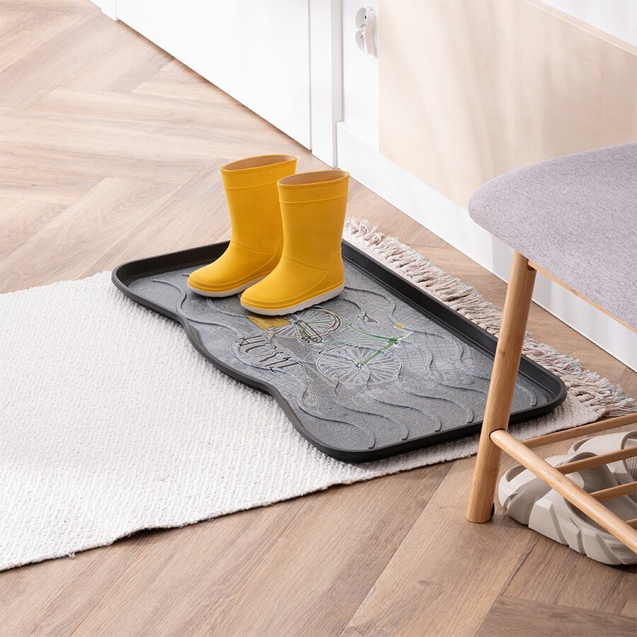 Plastový odkapávač na boty FLOMA Bicycle je moderní a praktický doplněk do každé domácnosti, kanceláře nebo auta. Díky originálnímu designu s motivem jízdního kola potěší nejen cyklisty, ale každého, kdo má smysl pro styl. Vyvýšený okraj odkapávače spolehlivě zachytí vodu, sníh či bláto z obuvi a udrží vaši podlahu čistou.