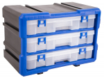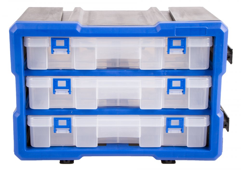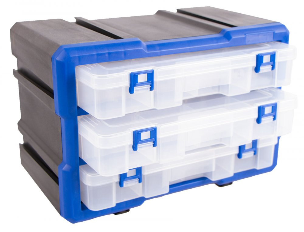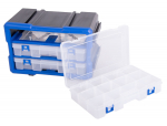 Plastový organizér se 3 uzavíratelnými průhlednými boxy, vhodný např. pro uskladnění a přehledné rozdělení šroubků, matic a dalšího nářadí, které by se mohlo zakutálet a ztratit. Každý box má 12 přepážek, které můžete libovolně kombinovat a uzpůsobit si prostor dle svých potřeb.