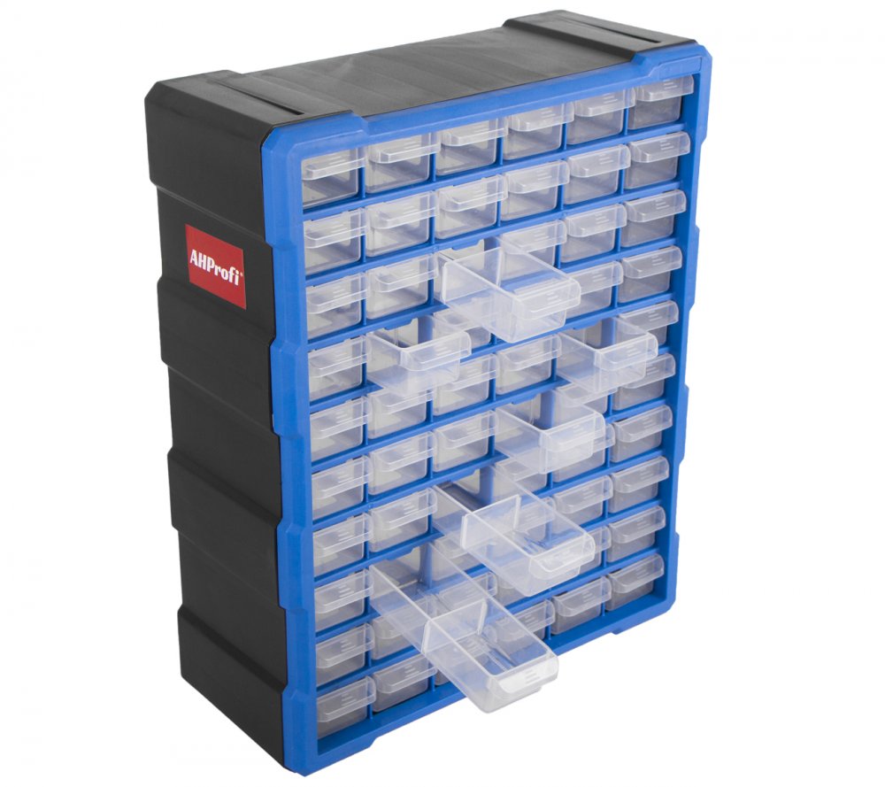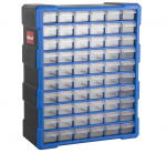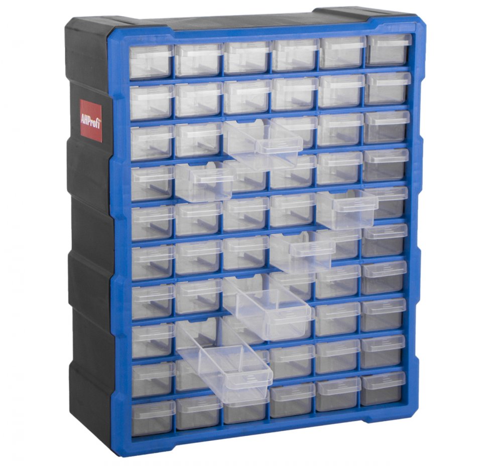 Plastový organizér s 60 zásuvkami lze jednoduše zavěsit na zeď, nebo např. z boku skříně, dílenského vozíku apod. Je možné ho postavit na ponk, nebo pracovní stůl a slouží pro uložení montážního materiálu a drobného dílenského vybavení.