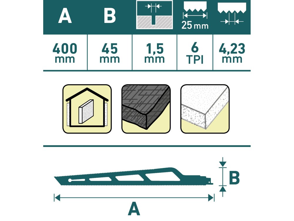 plátek lz použít na nejrůznější měkké izolační hmoty jako minerální vaty, polystyren atd. plátek má oboustranné ostří (6zubů/palec) a hrotová strana je velmi ostrá, takže s ní lze jednoduše proniknout do řezaného materiálu
